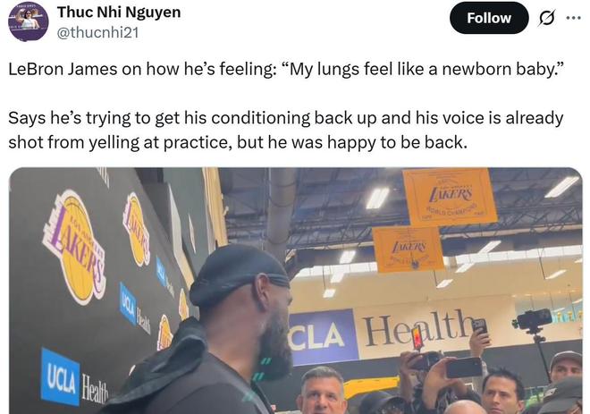 训练结束后接受采访时,詹姆斯坦言自己感觉目前自己的肺部就好像是新生儿一样,因此无论是从保持现有化学反应,还是保护詹姆斯健康角度出发,都可以适当降低詹姆斯的出场时间。