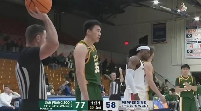 全场比赛王俊杰首发出战33分钟,投篮14中10,其中三分球9中7,无比高效轰下27分5板1帽,单场得分创造个人NCAA生涯新高,带领旧金山大学80-60锤爆佩珀代因大学,攻防两端存在感拉满。