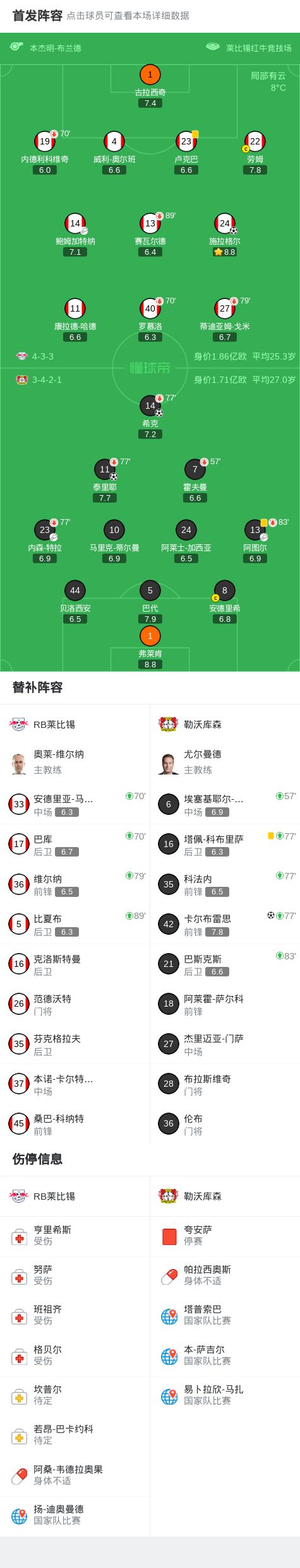 RB莱比锡vs勒沃库森:劳姆、古拉西奇首发,希克、霍夫曼出战