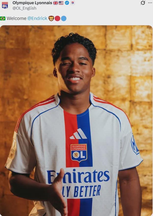 本赛季19岁的恩德里克在阿隆索手下仅仅出战了3场比赛,他将在里昂身穿9号球衣。